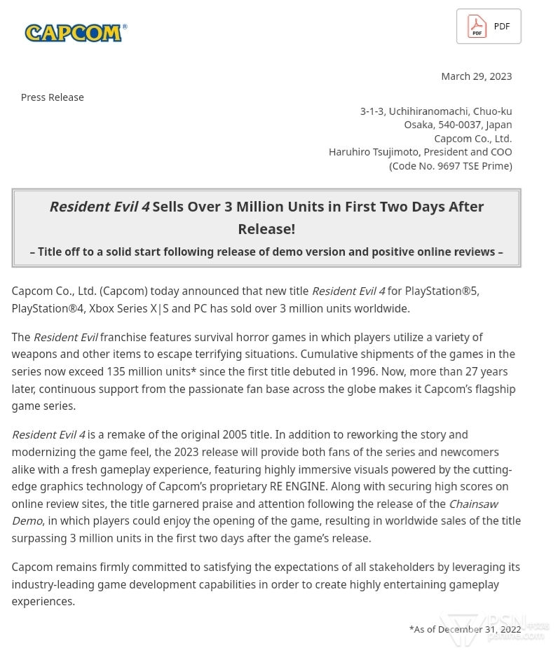 卡普空官方正式宣布《生化危机4重制版》发售两天全球销量已经突破300万份,已经远超同期的《生化危机2重制版》与《生化危机3重制版》