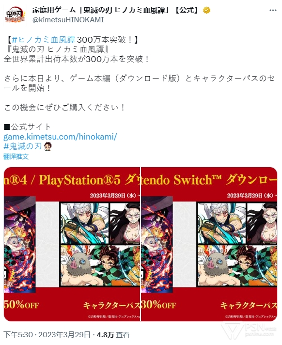 《鬼灭之刃:火之神血风谭》出货量突破300万份