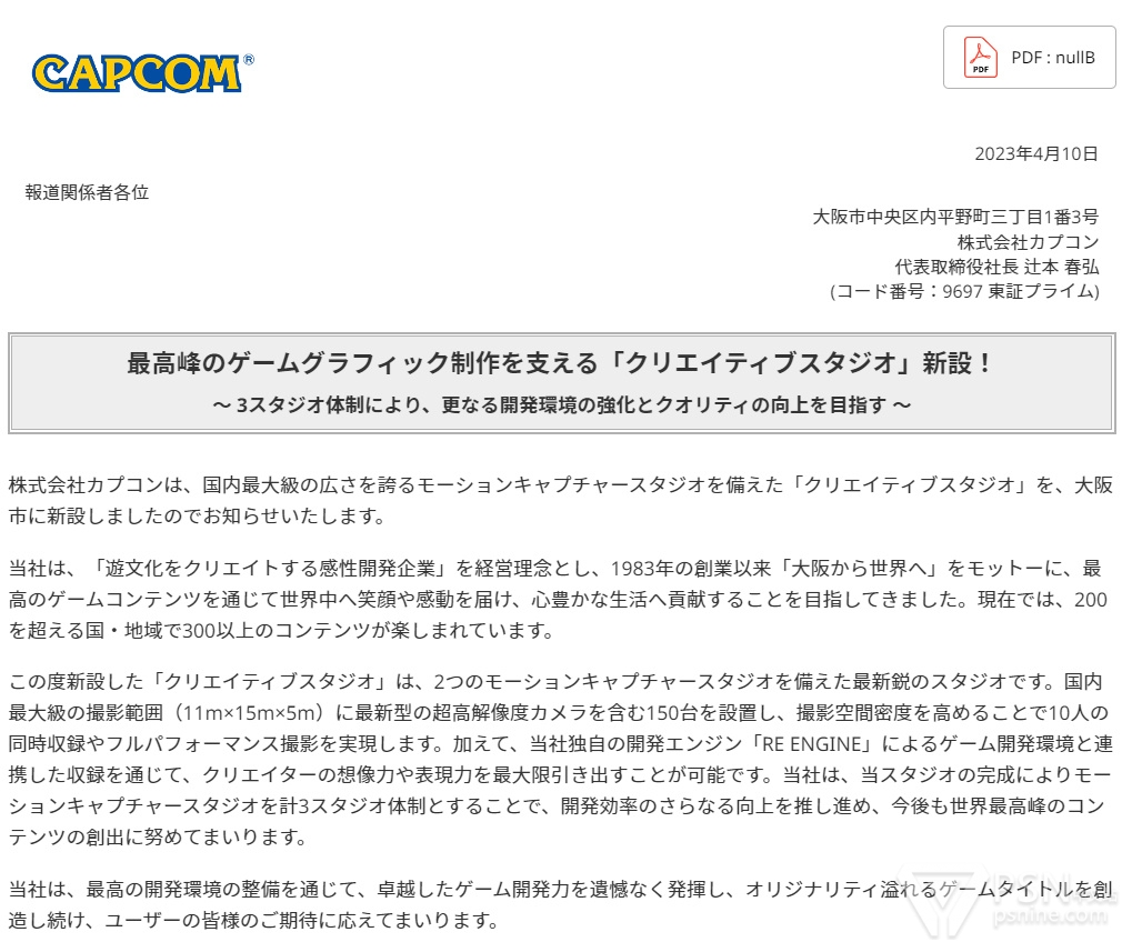卡普空宣布在大阪成立新工作室,职能主要是为新游戏开发提供专业的动捕技术,可供10位演员同时进行动捕演出,结合RE引擎能最大程度发挥创作的创意和表现力。