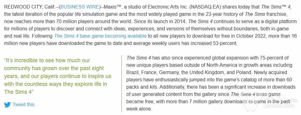 《模拟人生4》玩家数已突破7000万,成为了该系列历史上玩家数最多的一作。