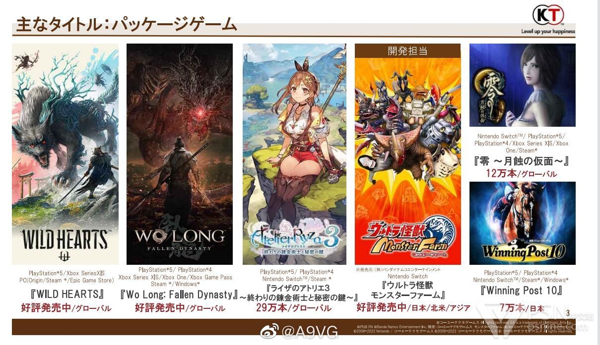 该财年着重以实现中期经营计划中的重点目标为首要任务,即推出《狂野之心》《卧龙 苍天陨落》等新作,并在Metacritic获得高评价;手游业务方面,运营中的作品表现稳定之外,新作《信长之野望 霸道》也正式开服;此外,还通过进行战略性投资重组提升营业外收支。以上使得公司在严峻金融环境下依然保持盈利,并实现了历史最高的销售额与营业利润。