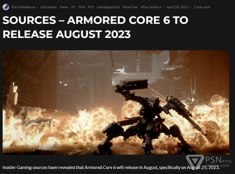 汤姆·亨德森报道称:《装甲核心6:境界天火》将于2023年8月25日发售