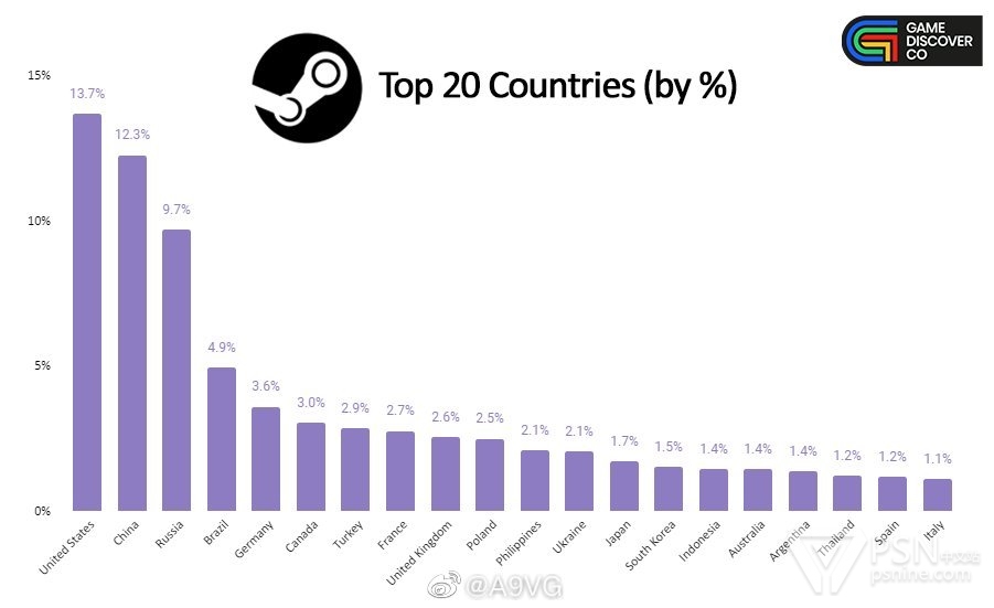 · Steam更为“国际化”,美国玩家占13.7%,中国玩家占12.3%,俄罗斯玩家占9.7%,东南亚+泰国也能占到4.7%