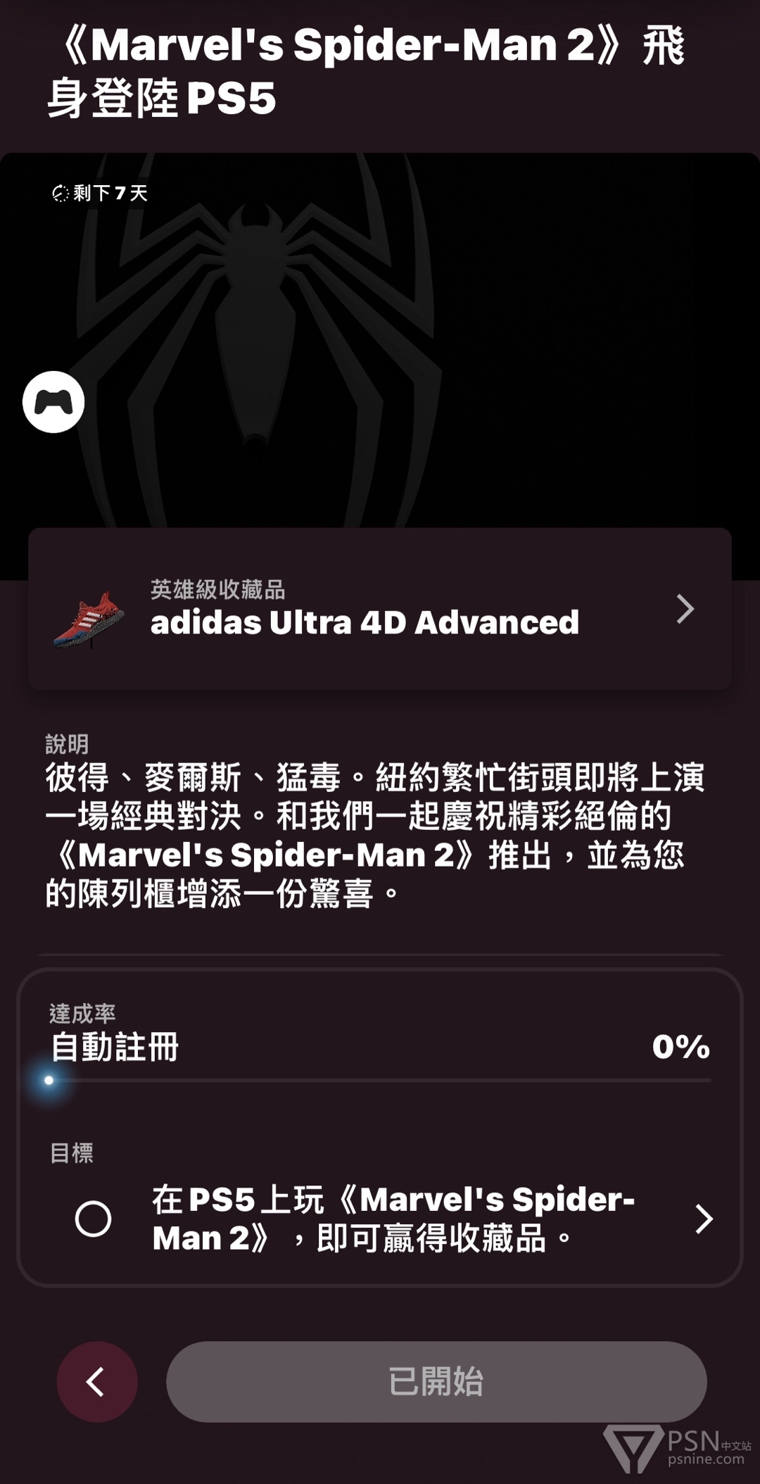 1.《蜘蛛侠2》飞身登录PS5,自动开启有效期至10月27日,运行该游戏即可完成,奖励为史诗级阿迪达斯联动跑鞋数字藏品。
