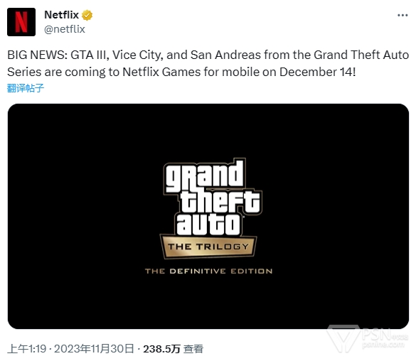 《侠盗猎车手:三部曲-最终版》将于2023年12月14日通过Netflix Games登陆iOS/Android,Netflix会员可凭会员资格游玩游戏(无需额外付费)。