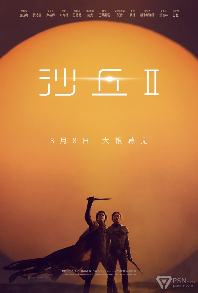 华纳兄弟今日宣布《沙丘2》国内定档2024.3.8日登录全国院线 比北美(2023.3.1)晚一周 本片由丹尼斯 维伦纽瓦执导 提莫西 查拉梅、赞达亚、蕾雅 赛杜、奥斯汀 巴特勒等人主演
