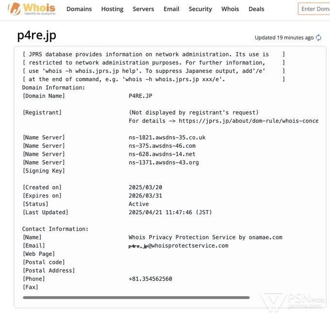 3月20日有网友发现ATLUS可能注册了一个名为“P4RE.JP”疑似是《女神异闻录4 重制版》的域名,而该域名已于4月21日被更新。此次的更新方式与此前一系列《女神异闻录》游戏在正式发布前所进行的域名操作类似:将该域名从日本注册商Onamae提供的通用着陆页服务器转移至专属服务器上。但与之前的域名更新所不同的是,此次并未显示域名托管方的地址。