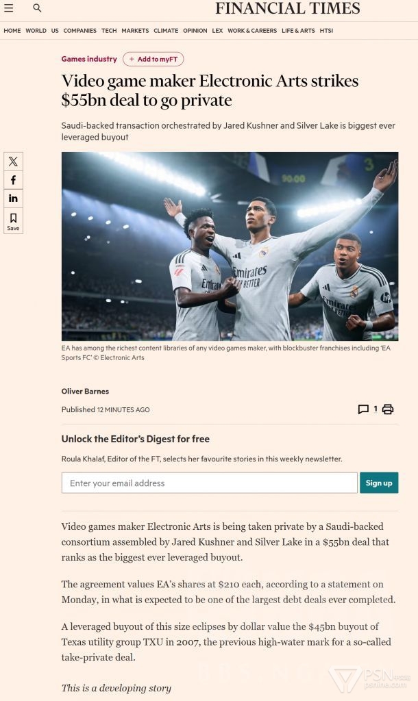 EA将被贾里德·库什纳的Affinity Partners、银湖资本和沙特主权财富基金以550亿美金私有化,这是有史以来最大的杠杆收购。