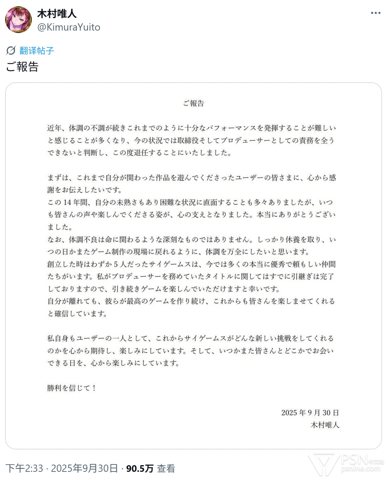 Cygames知名游戏制作人木村唯人宣布辞去专务取缔役和游戏制作人职务,自己负责的游戏已经交接完毕,会有值得信赖的同伴继续负责。木村表示自己近年身体状况不佳,无法完全发挥能力,因此打算暂时修养生息,以待有朝一日能回来继续制作游戏。