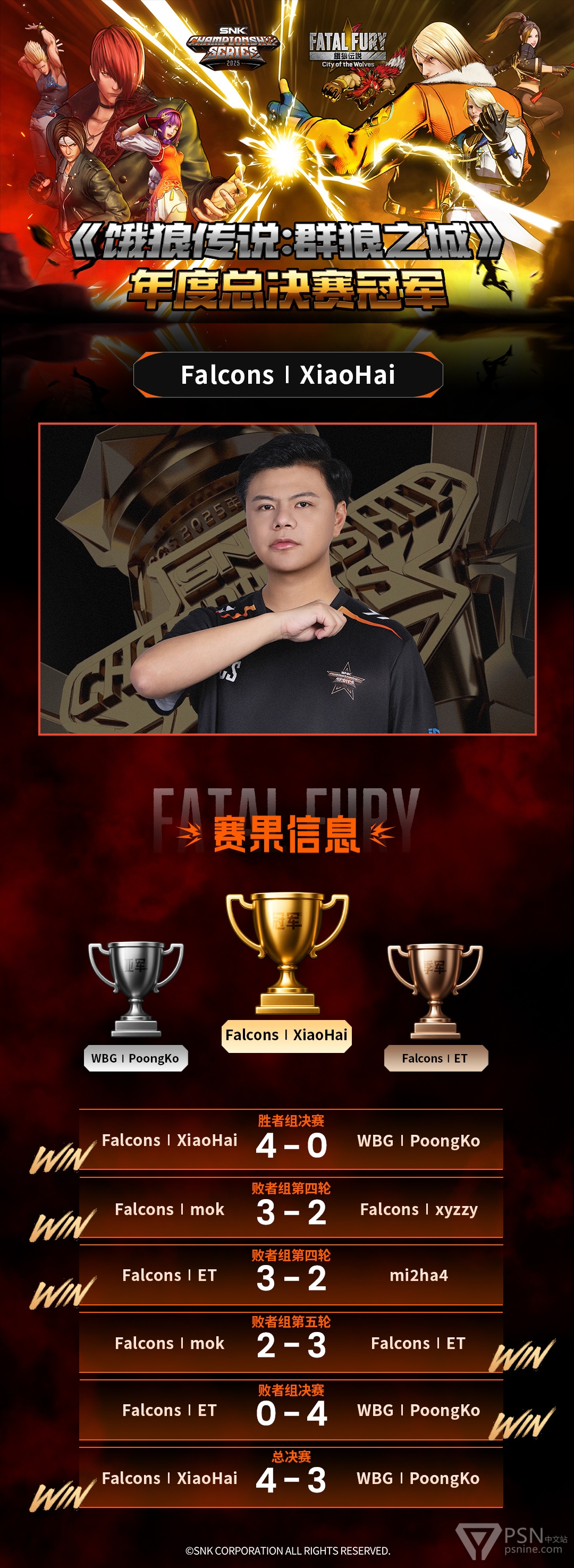 恭喜「Falcons|XiaoHai」夺得SCS 2025《饿狼传说:群狼之城》项目年度总冠军!