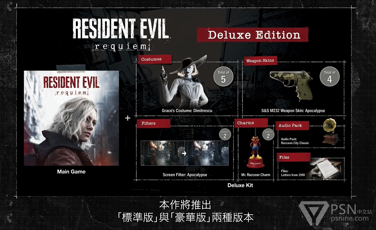 在今天早上7点的直播网络节目“卡普空TV!!”中,卡普空官方公布了《生化危机9:安魂曲》的10分钟介绍视频,并官宣本作预购现已开启,预计2月27日正式发售!据介绍,本作将推出标准版与豪华版两种版本,其中购买豪华版的玩家除了能获取包含标准版的完整游戏外,还能获得限定服装与武器造型组合,包括格蕾丝的服装:蒂米特雷斯库在内,共5套服装(Dimitrescu,《生化8》中“八尺夫人”阿契娜·蒂米特雷斯库的姓氏)!另外,预购玩家还能独家特典:格蕾丝的皮肤“末日”。此外,官方还将推出《生化危机9》主题的特别版Switch 2 Pro手柄,将采用灰暗风格设计,并加入了游戏中报纸文章的元素,完成呈现出本作阴沉的氛围感!