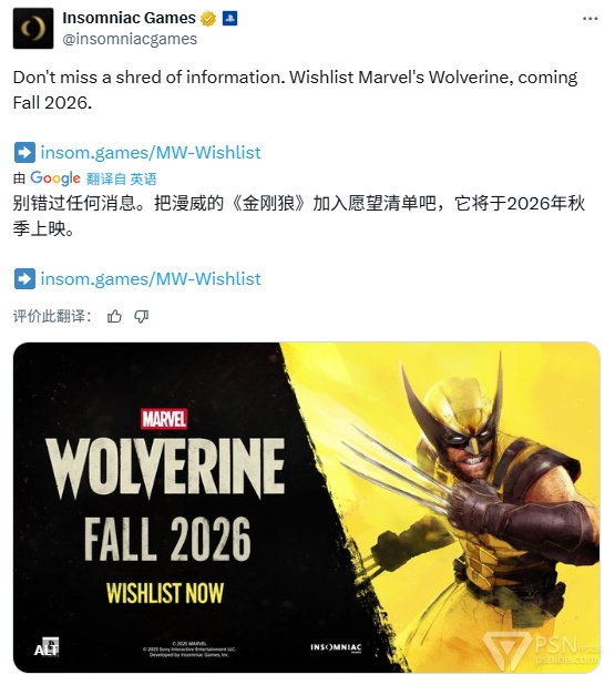 在《GTA6》宣布跳票至2026年11月19日发售后,失眠组(Insomniac Games)官推发文表示《漫威金刚狼》仍会在2026年秋季登陆PS5。