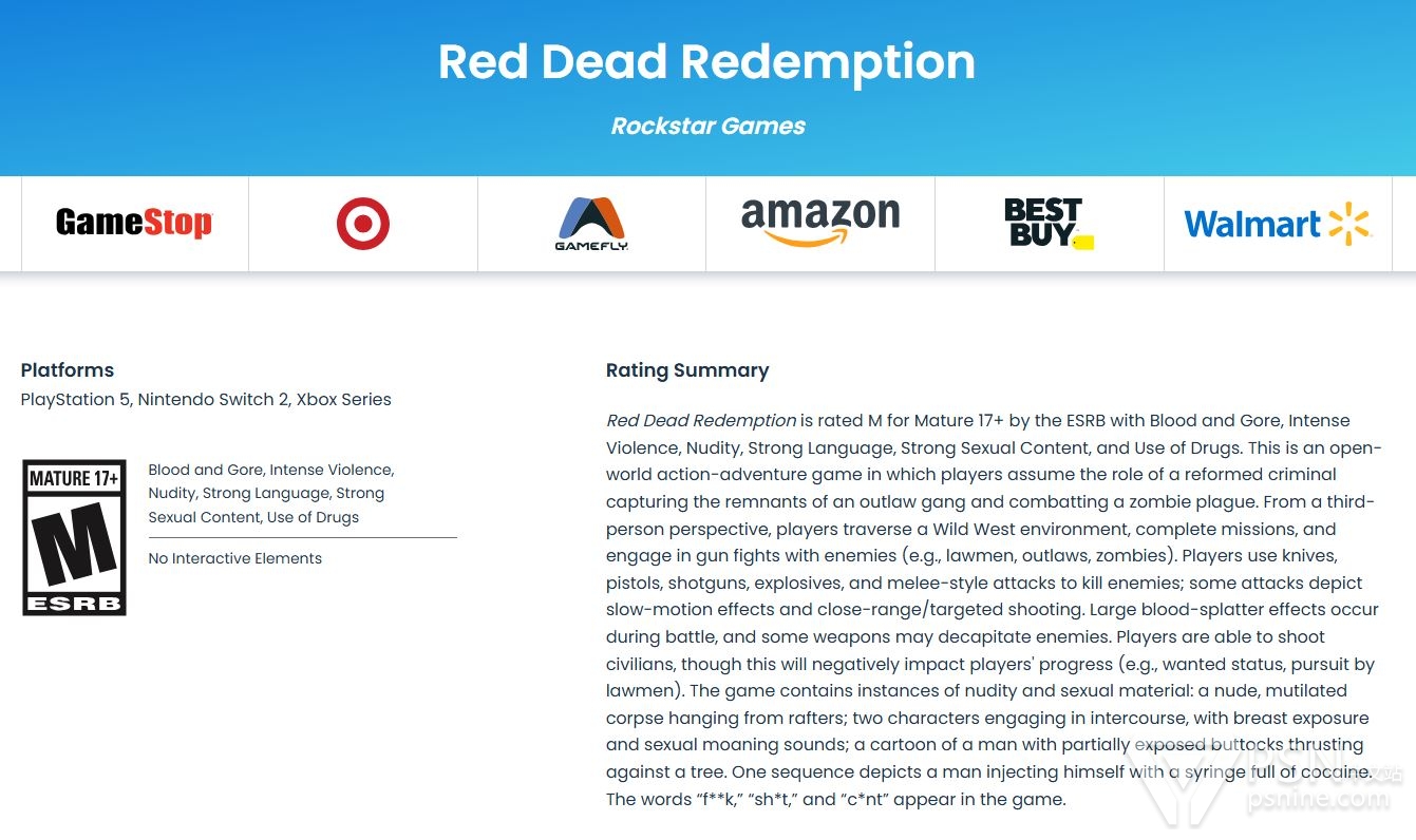 PS5/Switch 2/Xbox Series版《荒野大镖客:救赎》已在ESRB完成评级,获评M级(17+)。