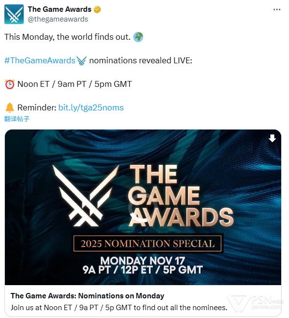 TGA官方宣布将于北京时间11月18日凌晨1点公开今年的提名名单,颁奖典礼将于12月11日在美国洛杉矶孔雀剧院举办。