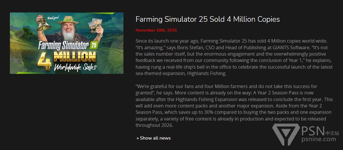 Giants Software首席战略官兼发行主管Boris Stefan感谢农场主们的支持,他表示:除了现已发售的第2年季票将带来的内容外,2026年本作还会推出多项免费更新内容。
