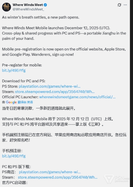 《燕云十六声》国际服将于12月12日推出手游版,与PC、PS版数据互通,手游版预约已开启。预约详情点击“出处”查看。