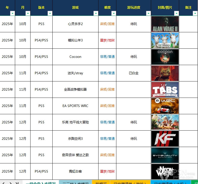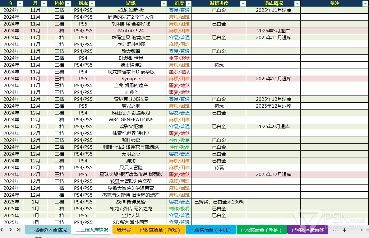 支持支持!我觉得这个会很有帮助,因为除了和朋友联机外,我基本优先打二三档和会免,也会很在意哪些游戏即将退库可以优先打,再加上各奖杯站目前貌似都没有可以自行编辑待玩列表,或比较方便整理游戏列表的方式(P9的游计我觉得并不方便所以没有考虑),所以基本我都是PS5主机上创建分类+自行制表记录的方式。