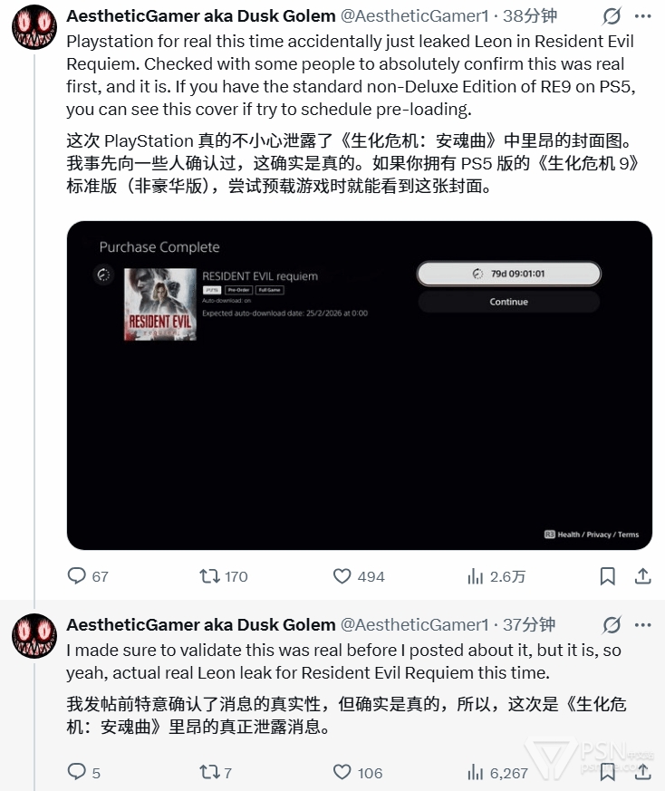 今日,我们曾报道过,知名爆料AestheticGamer aka Dusk Golem发长文坚称《生化9》里昂将会登场并且是可操作角色。对于网络中充斥的许多怀疑,他本人言之凿凿,直言不明白为什么卡普空会把一个大作中的主要角色(里昂)藏起来当成本作的噱头。然而,一切突然尘埃落定。Dusk Golem分享了PlayStation商店泄露出的预约预载的游戏封面,里昂赫然就在封面上。“这次Playstation是真的不小心泄露了《生化危机:安魂曲》中里昂的消息。我已经和一些人核实过,首先可以完全确认这是真的。如果你拥有PS5版的《生化危机9》标准版(非豪华版),尝试预约预载时就能看到这个封面。”外媒IGN已核实该图像真实性,确认里昂的登场千真万确。封面中面容沧桑的里昂矗立于另一位主角格蕾丝·阿什克罗夫特身后,其造型神似《生化危机4》经典形象。