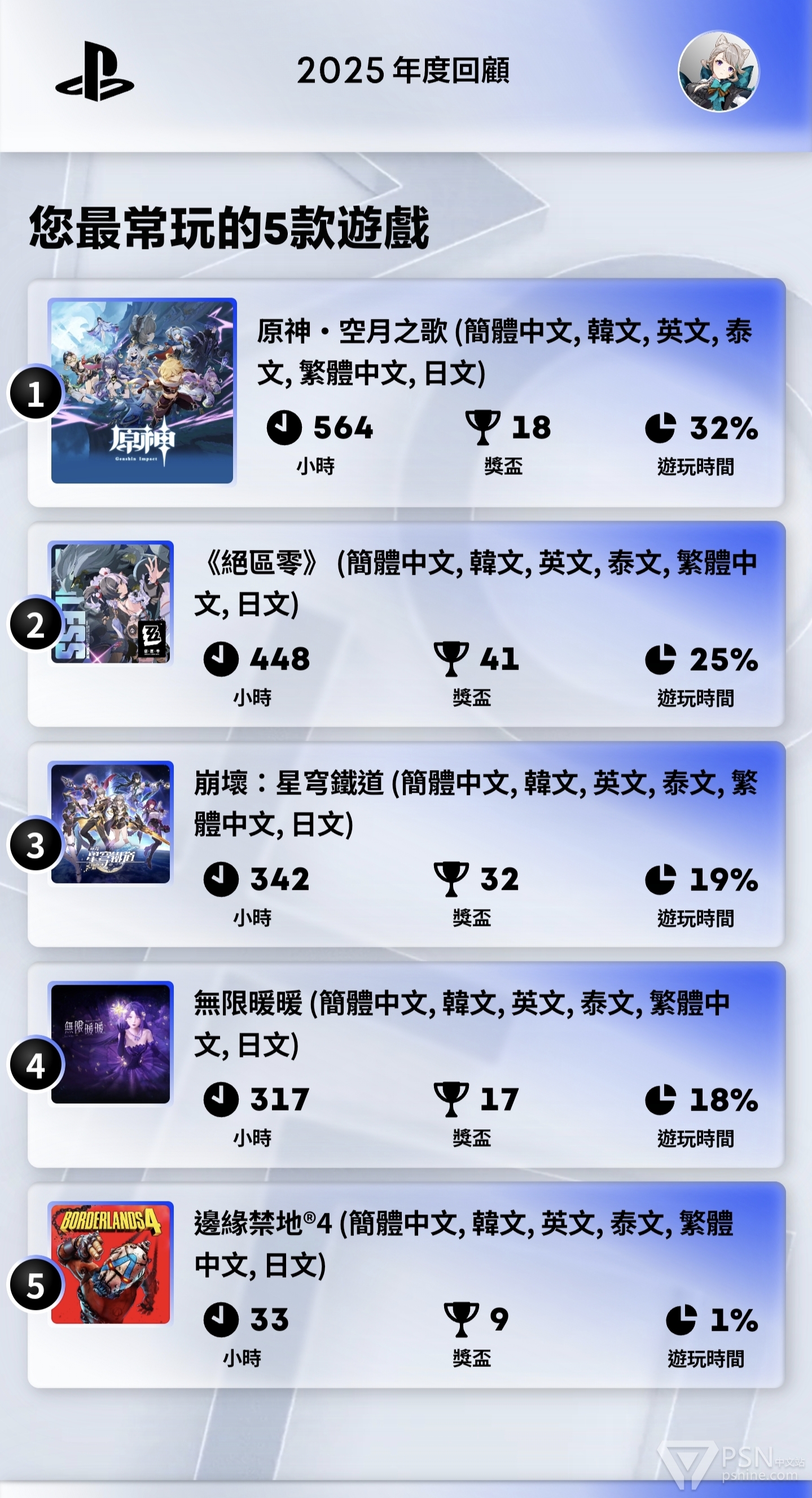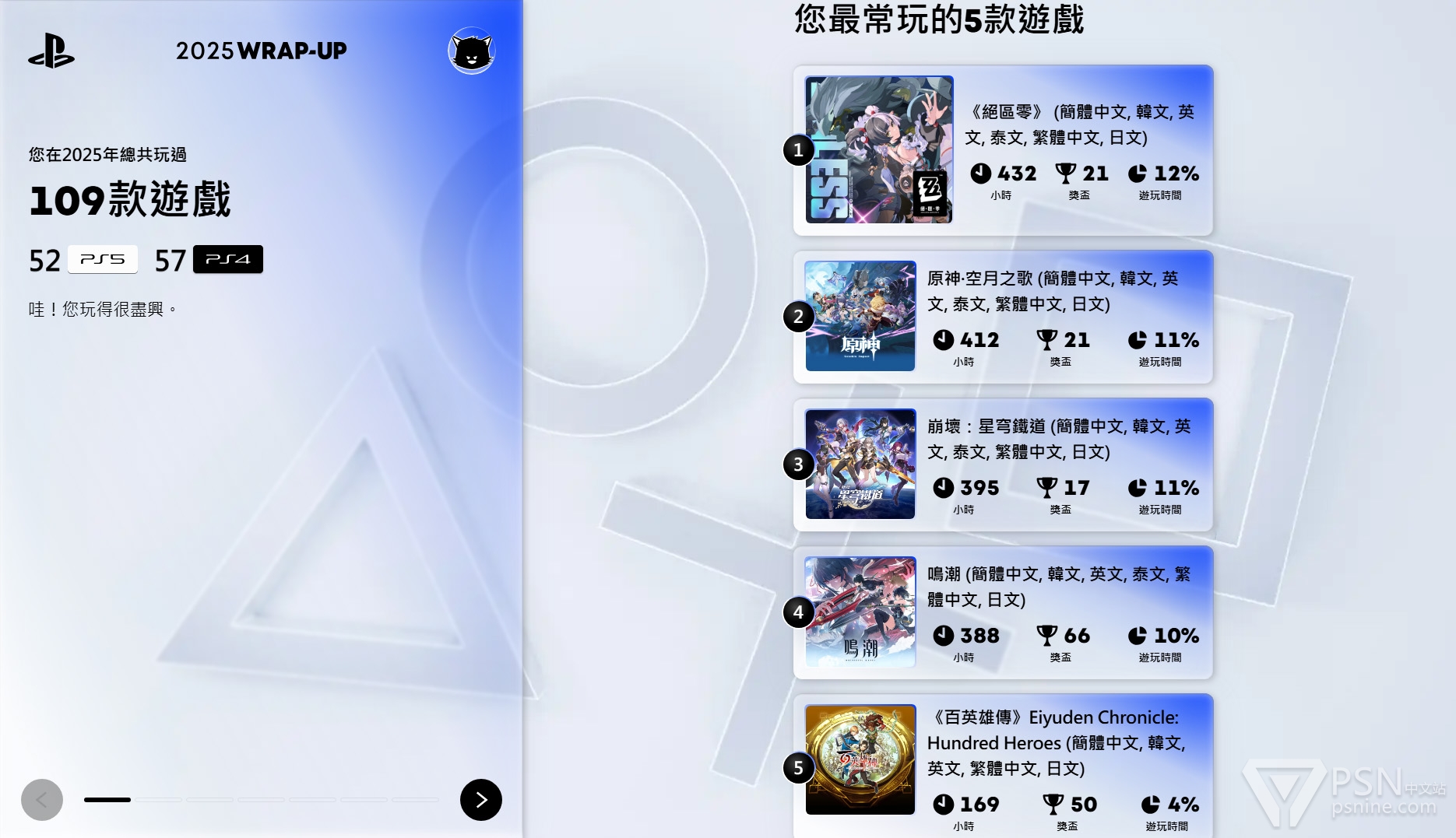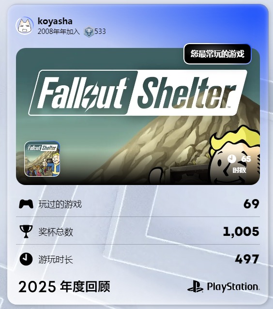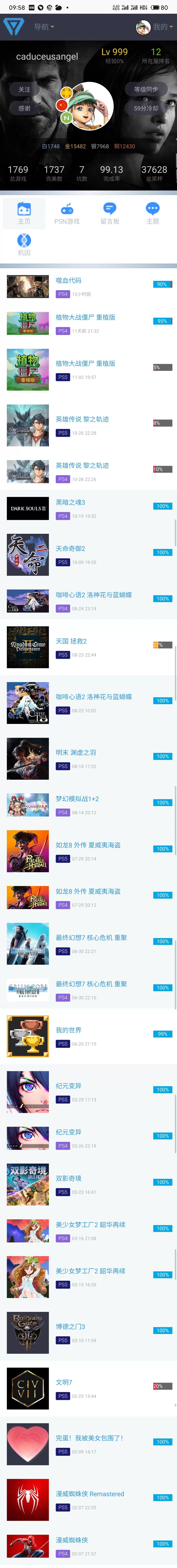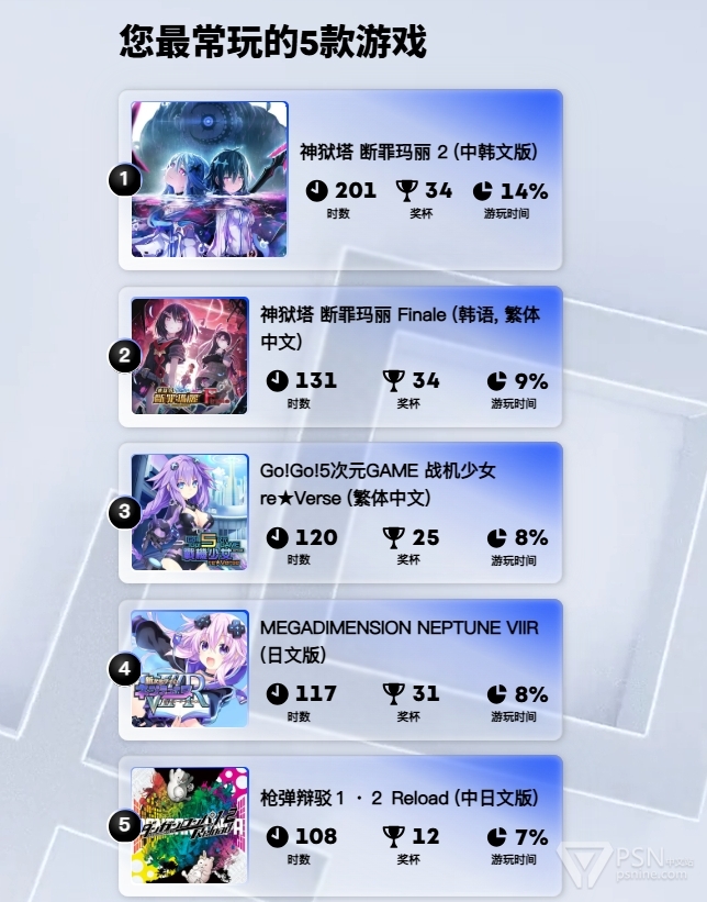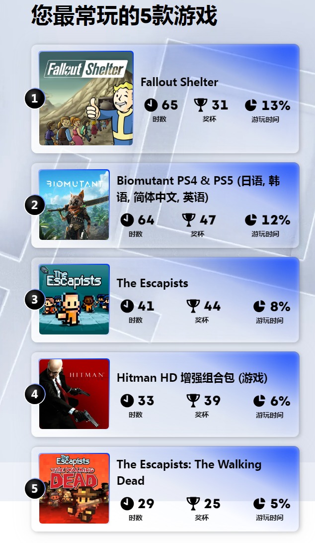 游戏时间912小时,游玩过的游戏38个,白金奖杯13个,还有一些有全成就但没白金奖杯的小游戏。但今年还玩了一些ns上的战棋、乙女、益智类游戏,所以总游戏时间应该能超过1000小时了