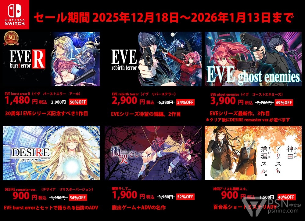 《EVE 夜行侦探》系列迎来30周年,官方发布贺图庆祝,Switch版本各作下载版日服商店促销活动开跑。