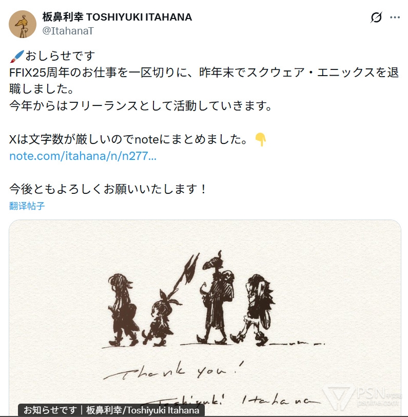 板鼻利幸 通过X(推特)表示,自己在完成《最终幻想9》25周年相关工作后,已于去年年末从Square Enix离职,从今年起将以自由职业者的身份继续开展活动。 除了《FF9》外,他还曾担任过《FF14》阿尔法&斯菲因、《陆行鸟的不可思议迷宫》等作品的人物设计。