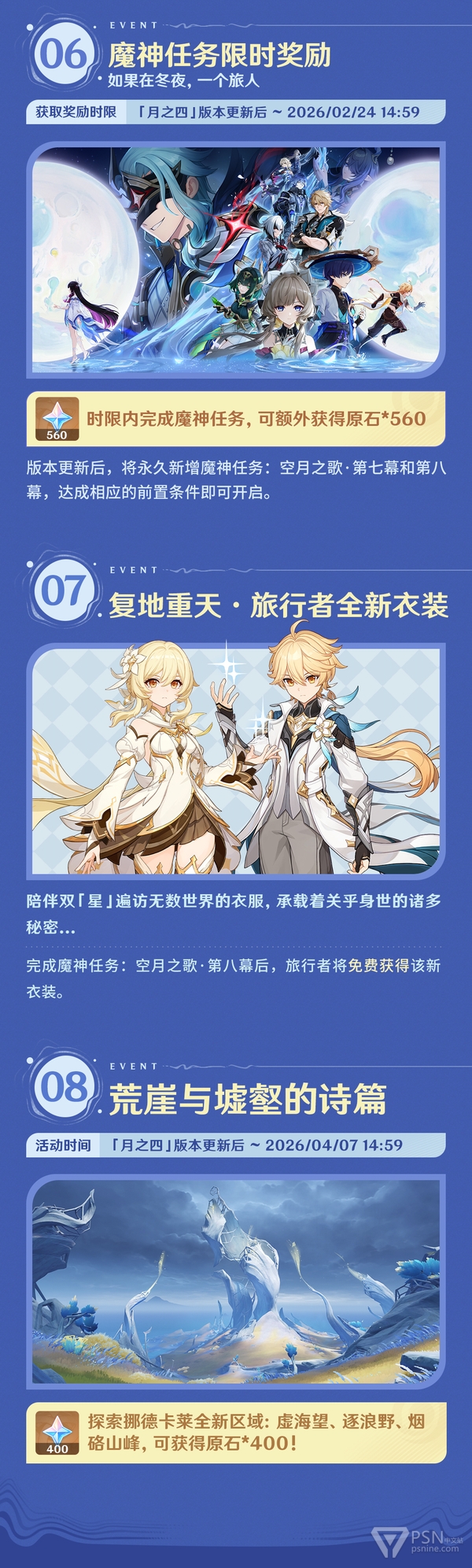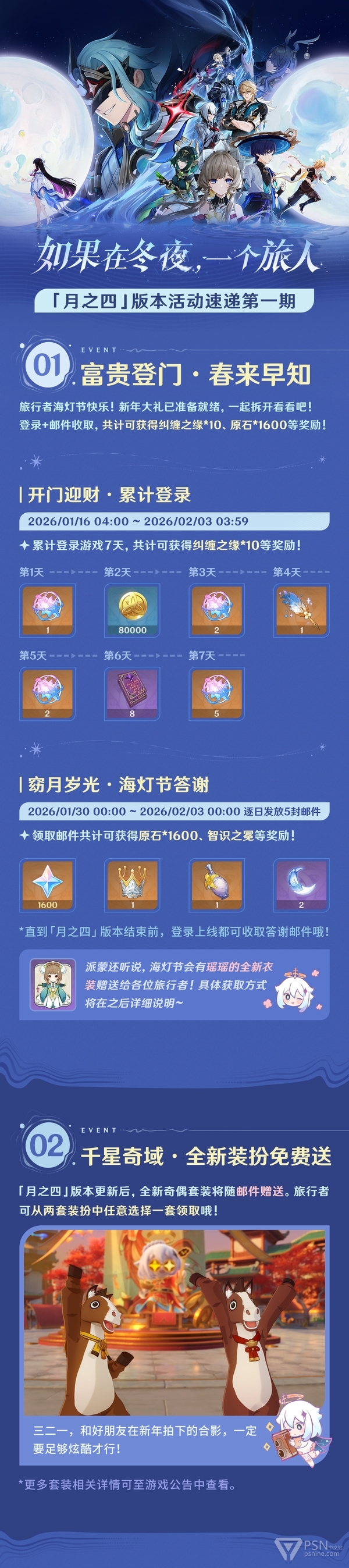 旅行者好呀~「月之四」版本「如果在冬夜,一个旅人」即将开启,一起来看看新版本中有哪些福利和活动吧!