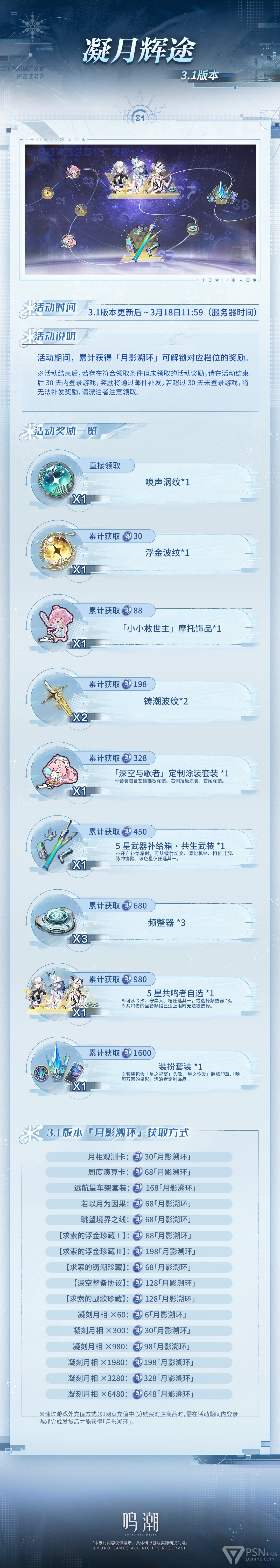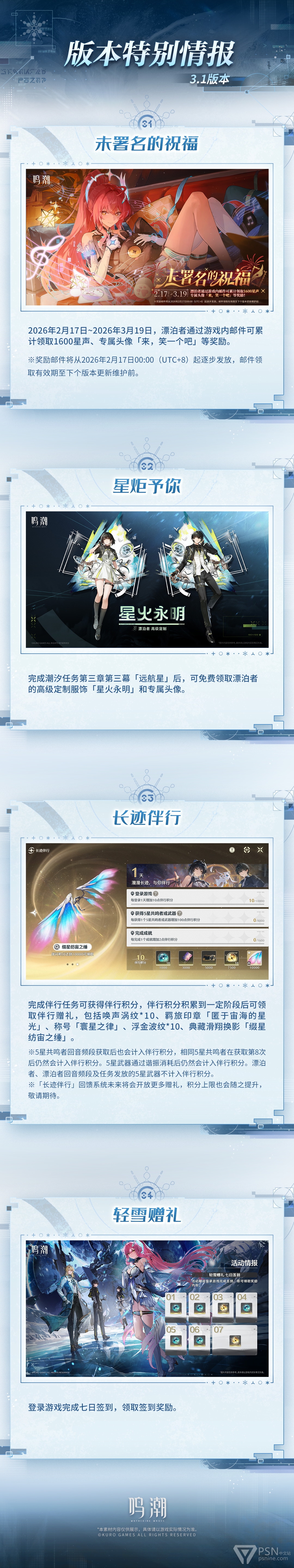 本期为漂泊者带来3.1版本中「长迹伴行」回馈系统、「凝月辉途」限时活动和「商城」内容的具体资讯。此外,活动期间漂泊者可免费领取1600星声、高级定制服饰「星火永明」等奖励,欢迎漂泊者查看!