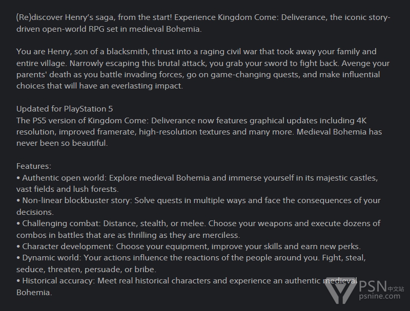 北京时间今天凌晨,Gematsu报道称:在英国等地区的PlayStation Store,《天国:拯救》商店页面的产品描述中出现了「PS5版更新」的相关信息。