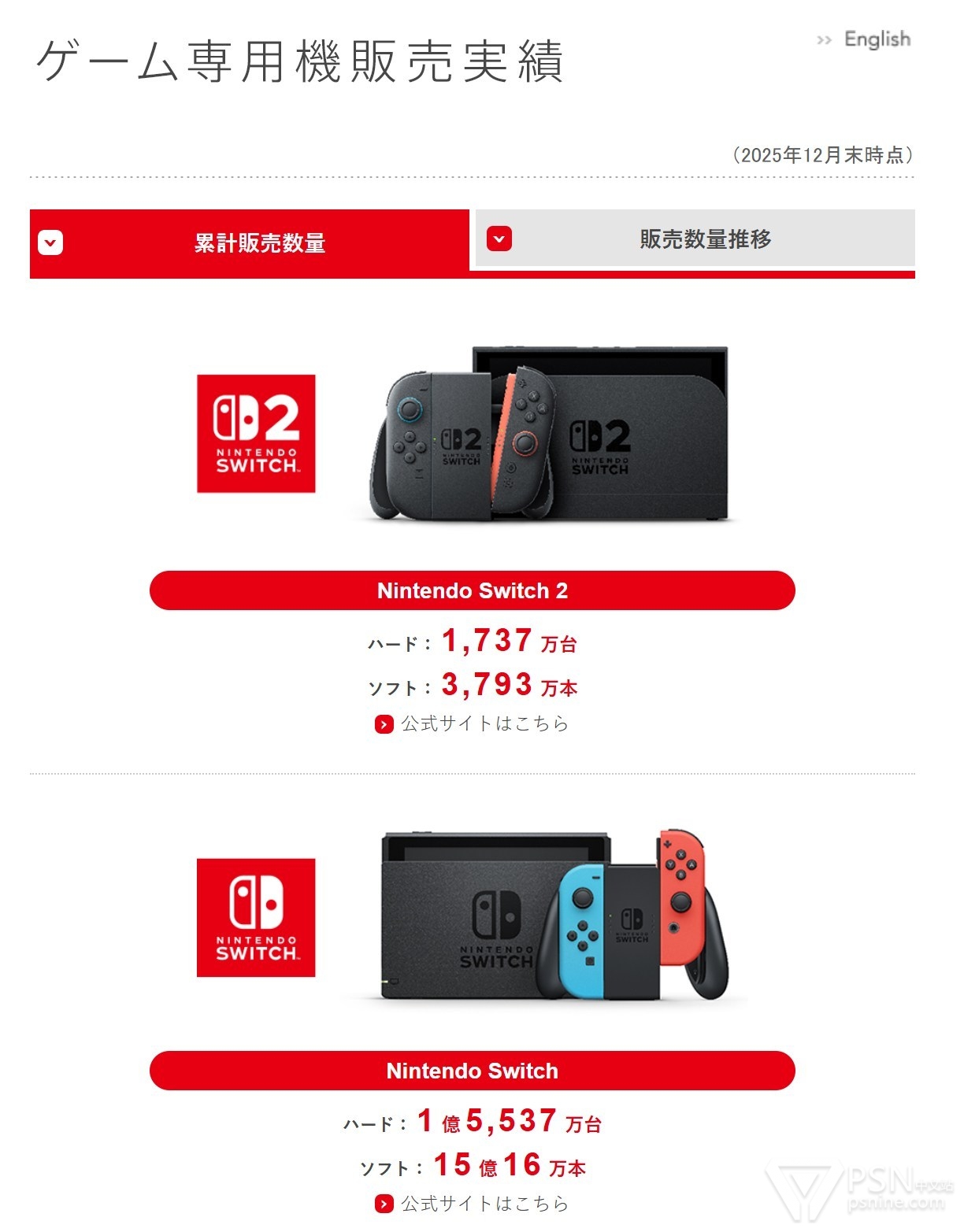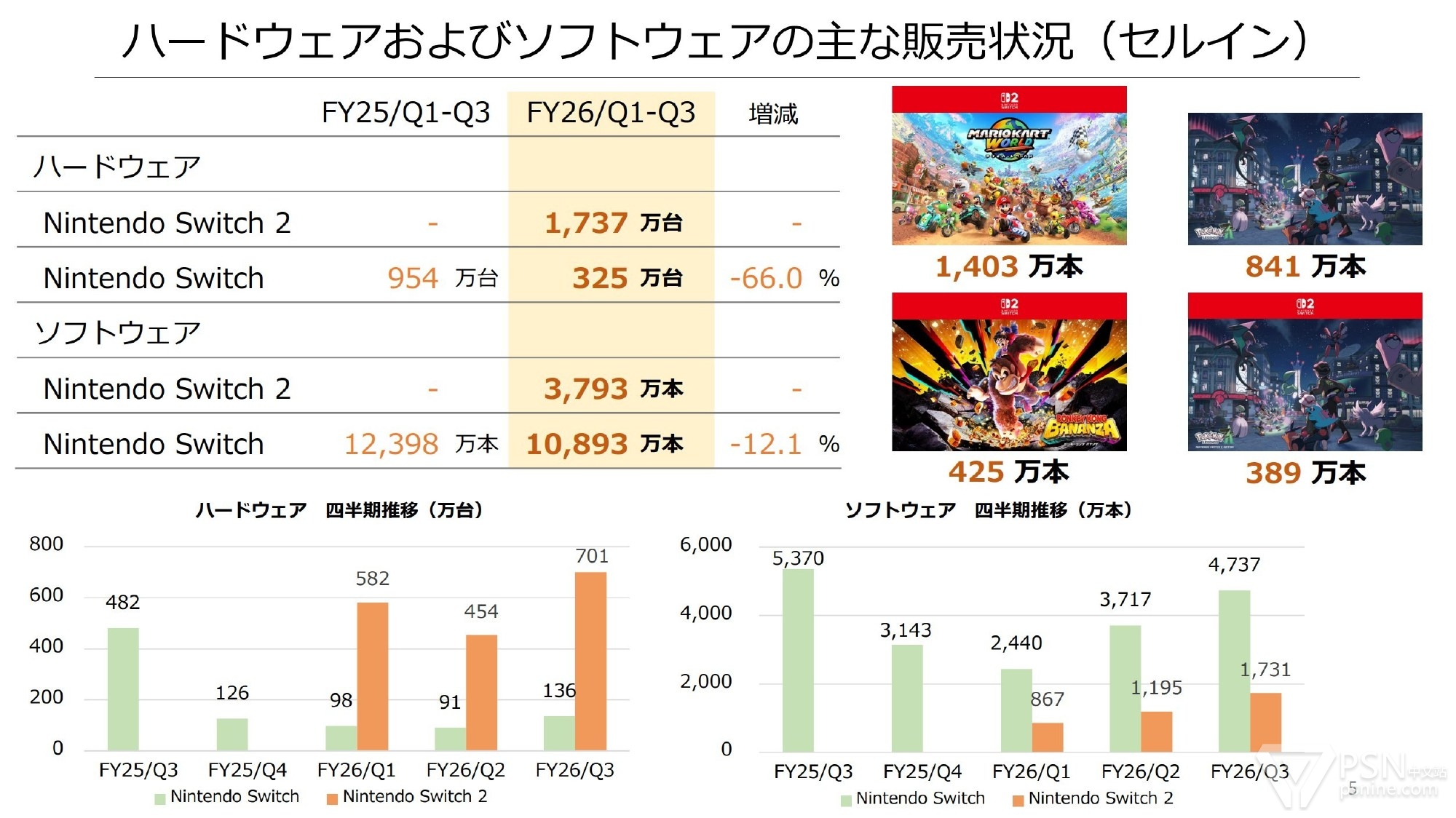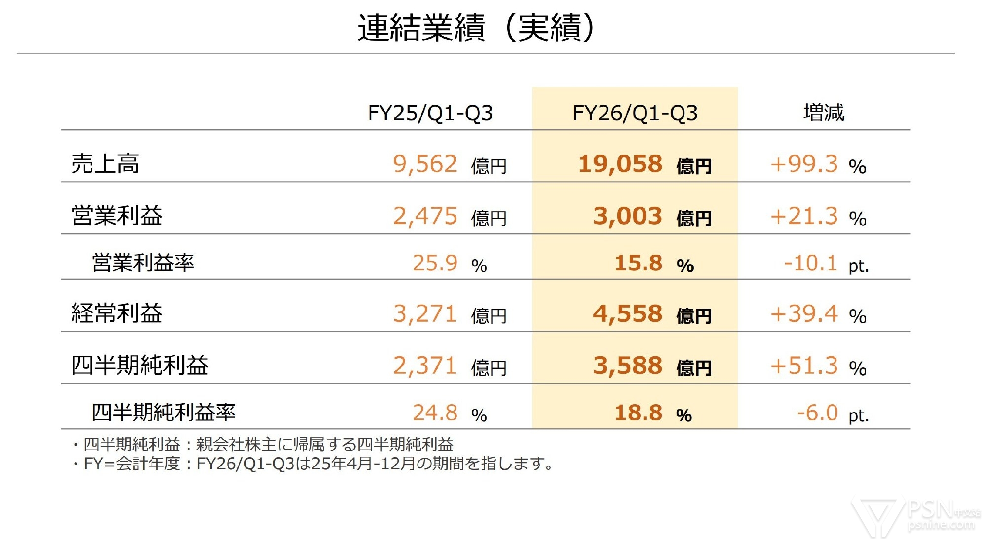 任天堂公开25-26财年Q3财季财报,截止至2025年12月底销售额19058亿日元同比增长99.3%、营业利润3003亿日元同比增长21.3%。Switch2销量1737万台,软件3793万份。Switch累计销量1亿5537万台、软件15亿16万份。