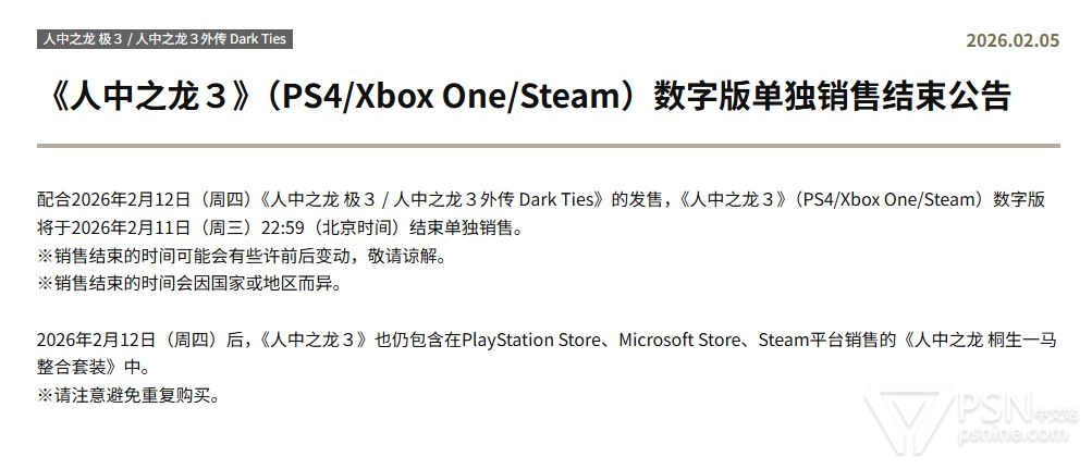 PS4/Xbox One/Steam版《如龙3》将于北京时间2026年2月11日22:59结束单独销售。