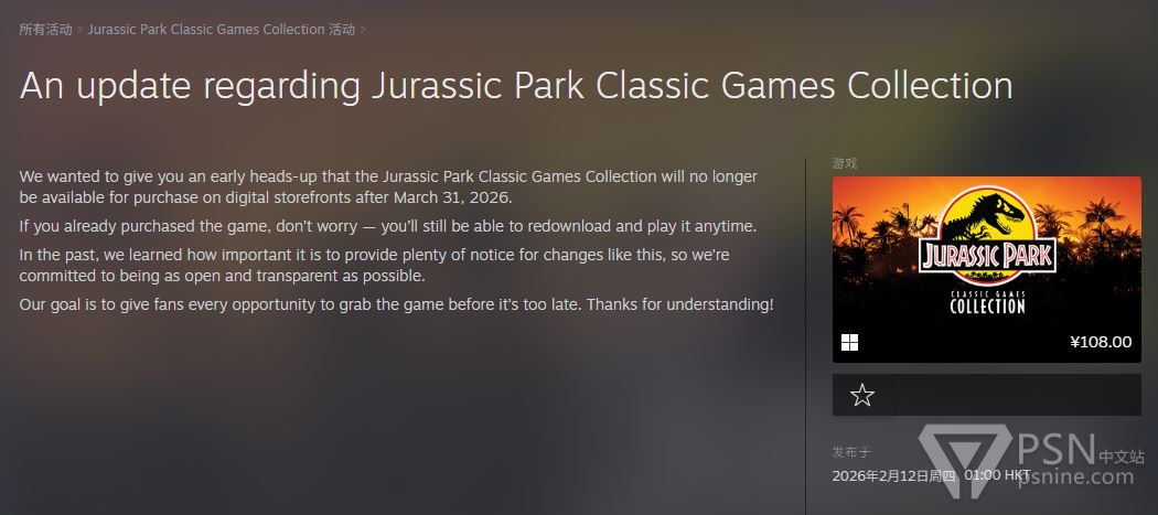 《侏罗纪公园:经典游戏合集》将于2026年3月31日下架停售,已购买游戏的玩家停售后仍可正常下载游玩。