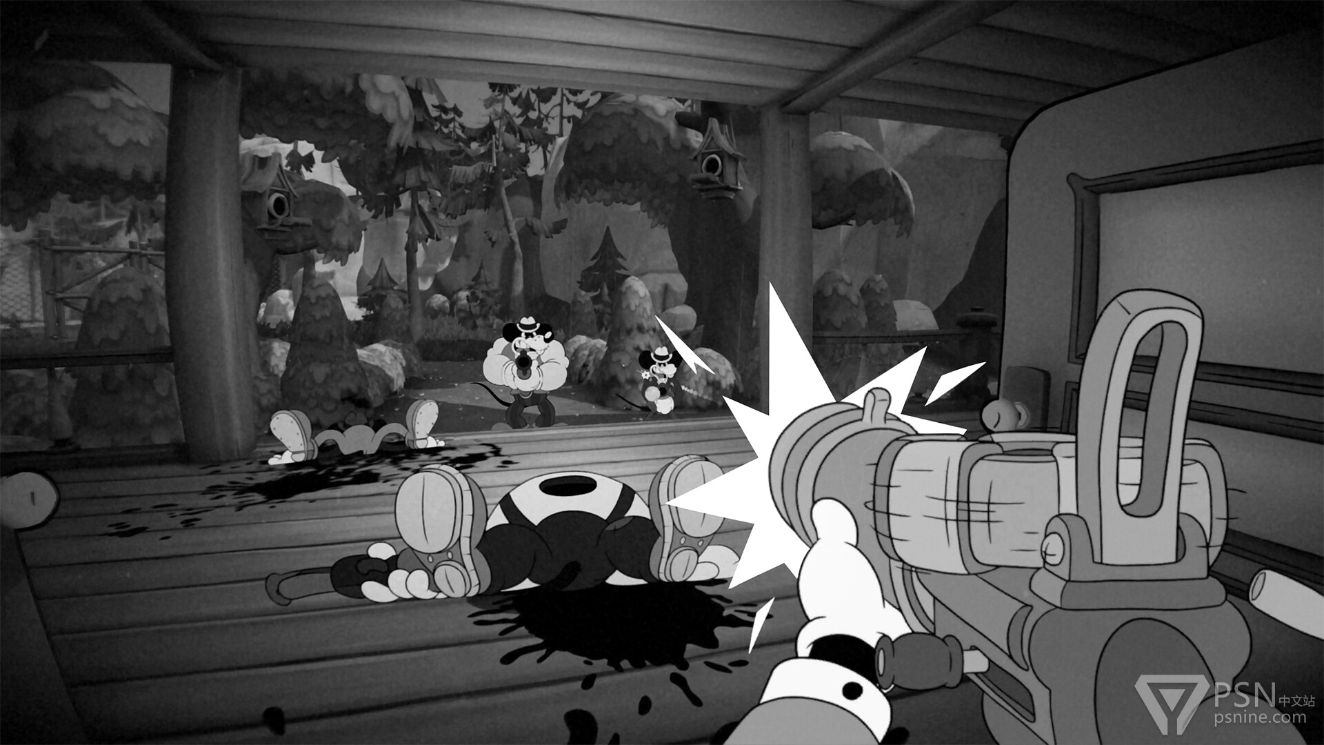 本作是一款第一人称射击游戏,采用了1930年代的经典手绘橡皮管动画风格。玩家将与私家侦探杰克·佩珀一起,投身一场弹雨连天、爵士绕梁的冒险。