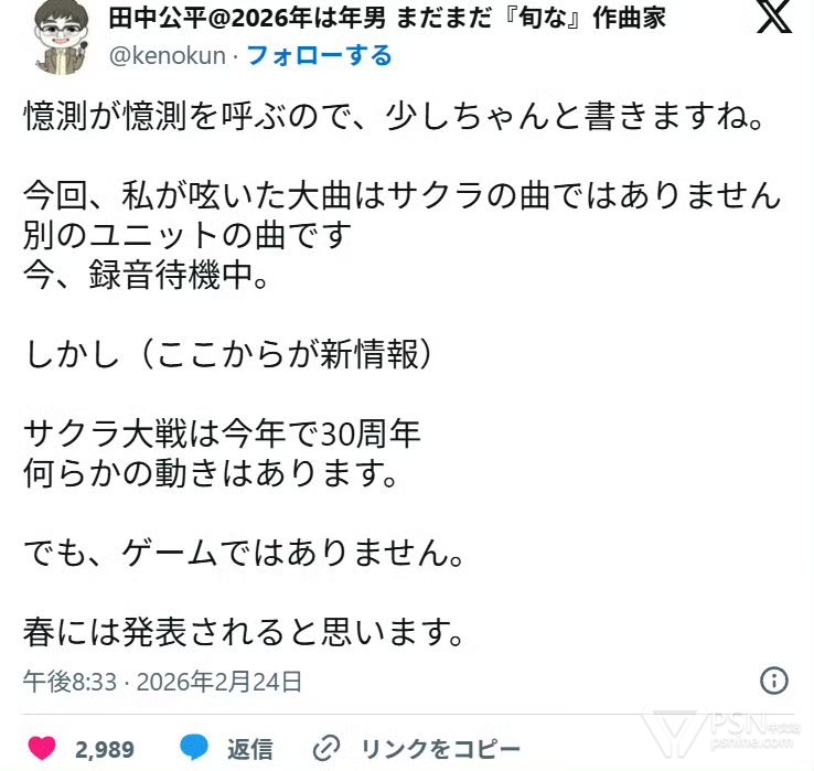 知名作曲家田中公平昨晚通过SNS表示《樱花大战》系列30周年纪念相关企划正在推进中,详情预计将在春季发表,不过他也明确表示本次新动向“并非游戏作品”。