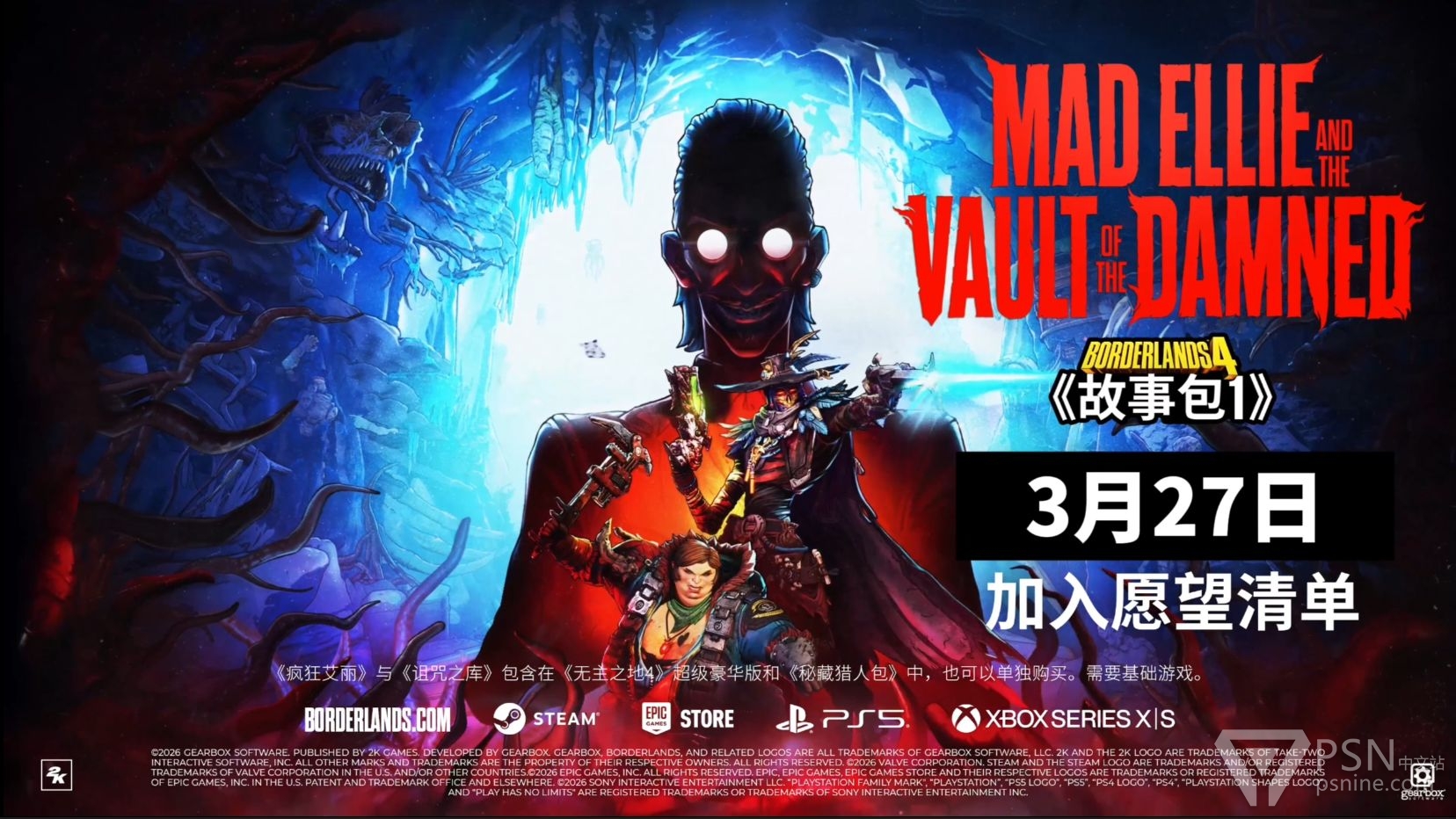 《无主之地4》故事包「狂野艾丽与诅咒秘藏」将于2026年3月27日发售。该故事包包含在游戏的「秘藏猎人包」和超级豪华版中,也可单独购买。
