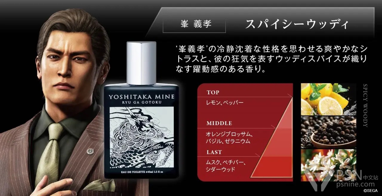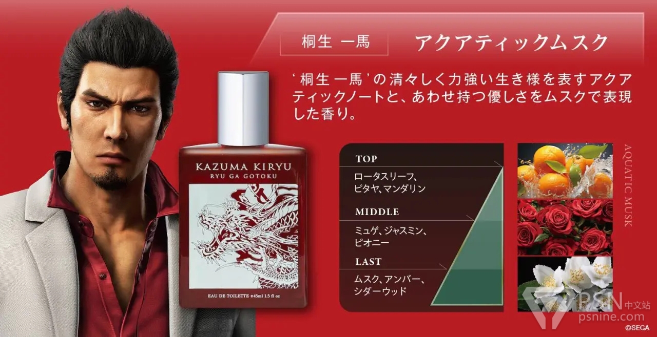 《人中之龙》系列公布了两款以桐生一马和峯义孝不同性格而设计的香水。其中桐生一马的香水以莲花调香,表现其清爽而坚毅的人生姿态,并以麝香来诠释其内心深处的温柔。而峯义孝的香水,则以清爽的柑橘调表现其冷静沉着的性格,并以黑胡椒的辛辣来诠释其隐藏于内的疯狂。这两款将于4月4日起售卖,价值4400日元。