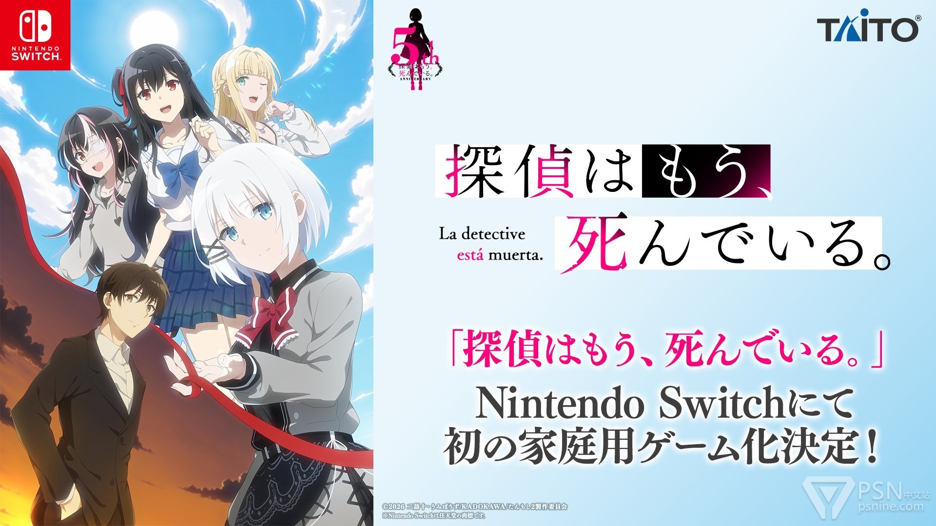 TAITO宣布轻小说《侦探已死》(侦探已经,死了。)将制作游戏化作品,预定登陆Switch平台,目前游戏内容和玩法尚未公布。