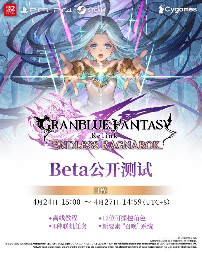 《碧蓝幻想Relink 无尽黄昏》将于4月24日-27日举办公开测试,全部对应平台(Switch2、PS4/5、Steam)的所有玩家都可以参与。公测版本包含教程和4种任务,并可以体验到新的召唤系统。NS2版还可以测试本地联机功能。