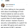 关于《最后生还者 第二幕》泄露的的后续爆料Jason Schreier在推上发表了新推文,大致总结一下就是:黑客在顽皮狗之前出品的游戏中找到了一个漏洞,利用这个漏洞访问了顽皮狗的服务器,从而盗取了...