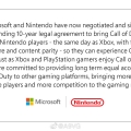 微软总裁Brad Smith今日宣布,微软现已跟任天堂签署了一份为期10年的合同,承诺将把《使命召唤》带给任天堂玩家,与Xbox版同日发售,游戏功能与内容完全相同,这样任天堂玩家也能跟PS与Xbox玩家...
