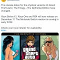RockStar 更新了《GTA三部曲 决定版》实体版发售日期,Xbox Series、Xbox One和PS4版将延期至12月17日,Switch实体版延期至2022年初发售。