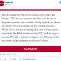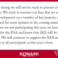 KONAMI通过官方推特发表声明宣布将缺席E3 2021,但同时表示目前公司有一些“关键项目”正在“深入开发”之中,并会在未来几个月分享相关更新,请各位关注