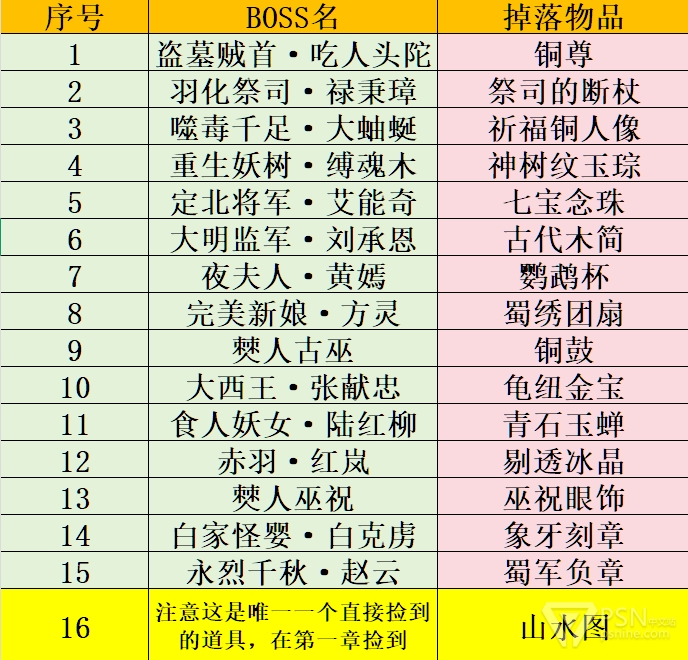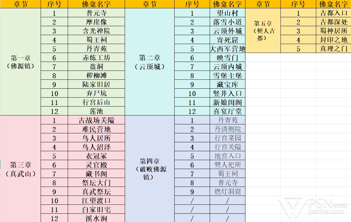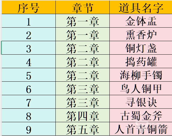 【还有就是这个游戏第三章是个分水岭,因为到了第四章往后,前面地图的地形就会发生改变,到时候,你就没法回到第一章正常的佛缘镇了,所以一定要在第三章之前检查清楚自己身上的物品清单是不是收集全了,保险起见,我这里还是一章一章的用EXCEL表格显示,方便大家分清楚![]() 】 |