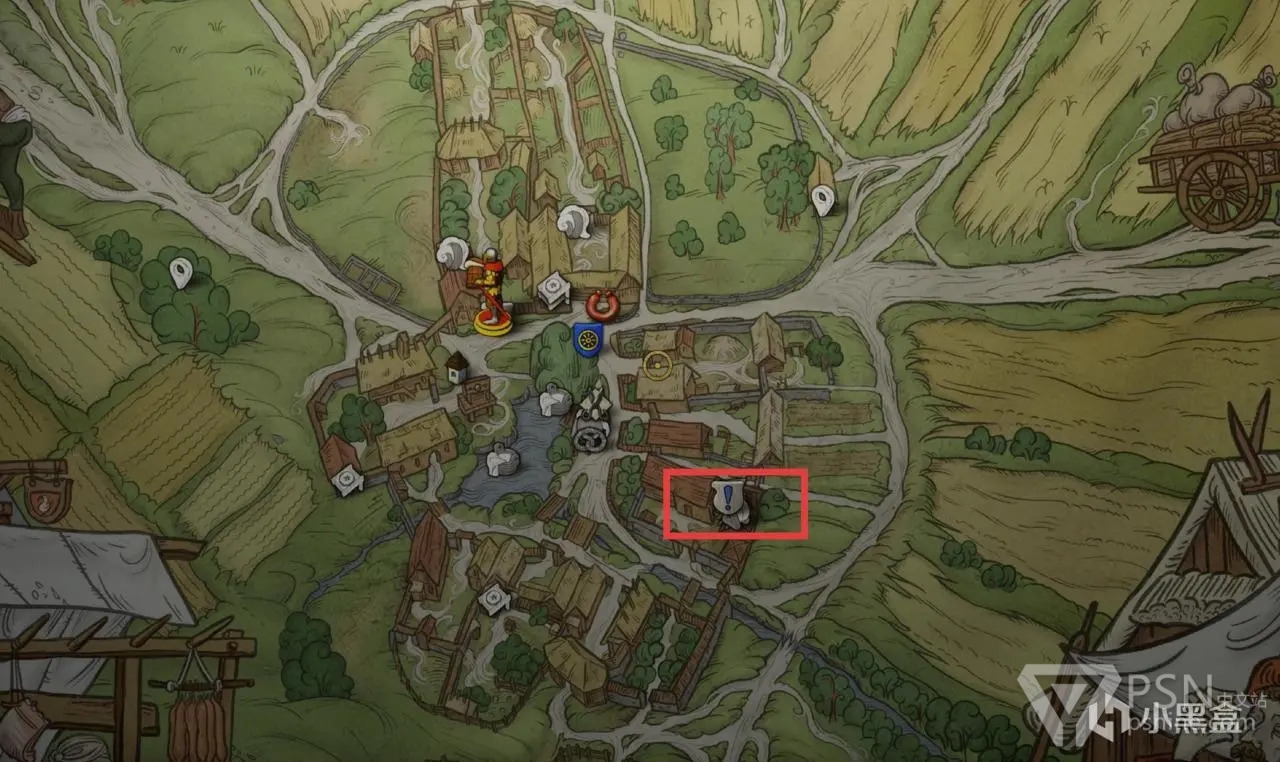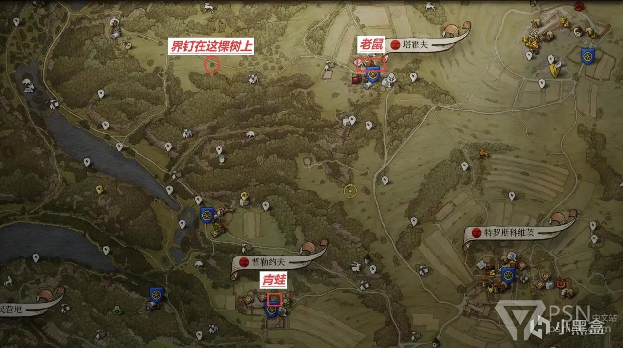 任务接取地如上图所示,只做成就的话“老鼠”和“青蛙”选一边做就行,不管是砍柱子还是涂牛都行。做完后触发任务“蛙鼠恩怨”这次两边那边都别帮,选择去找执政官试图和平解决。跟着指引走找到界钉后换不换位置都可以,不影响休战跳杯。