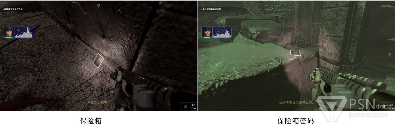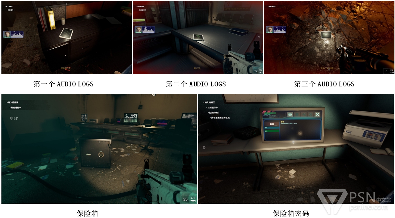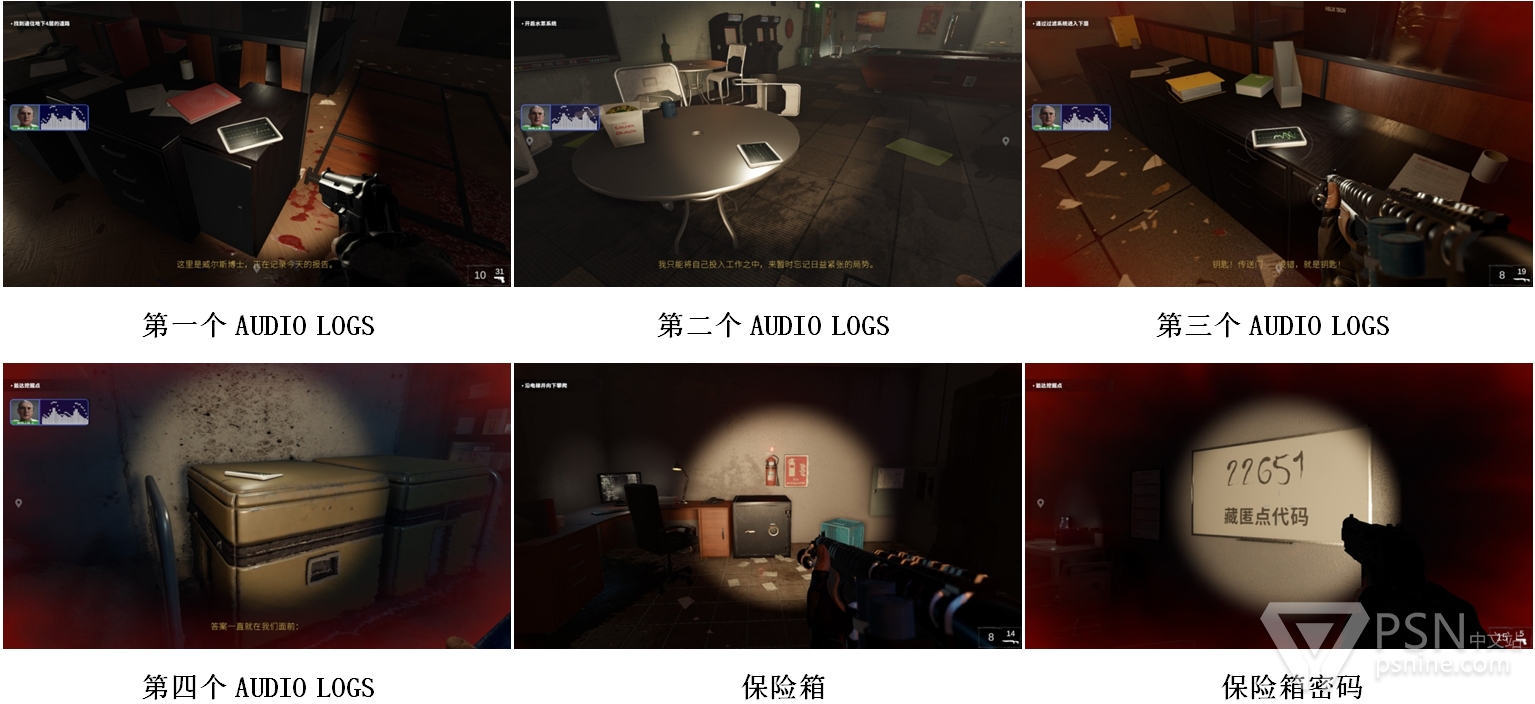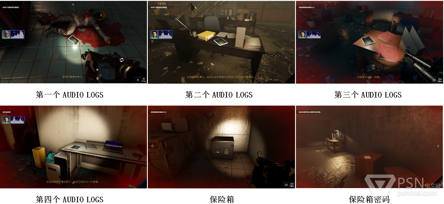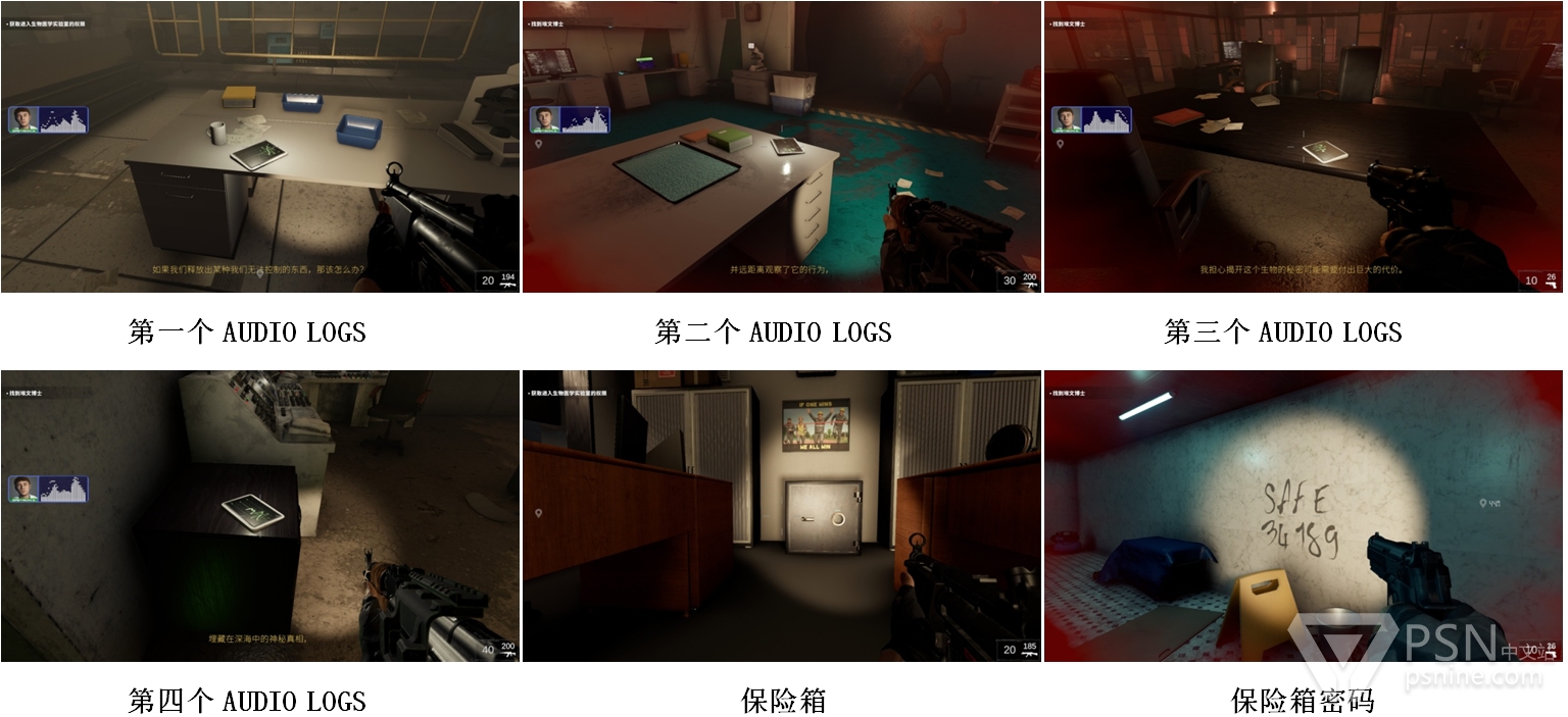 ____提示:“AUDIO LOGS”指的是类似IPAD的电子设备,调查其后会出现人物语言记录回放。而“保险箱”则需要输入所在章节内的密码提示后才能开启(这些密码都是随机的)。这两个物品的收集,关系到与它们相关的两个PSN奖杯的获得。而此游戏中其他的数据、文档等收集与查看,均没有相关PSN奖杯设定。