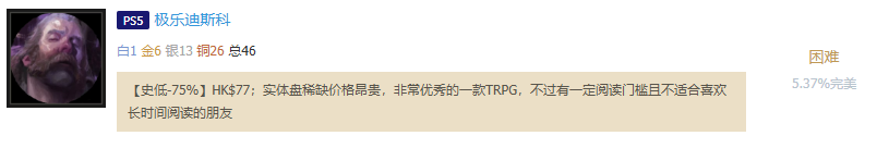 PS5极乐迪斯科 【史低-75%】HK$77;实体盘稀缺价格昂贵,非常优秀的一款TRPG,不过有一定阅读门槛且文本量极大,谨慎购入 |