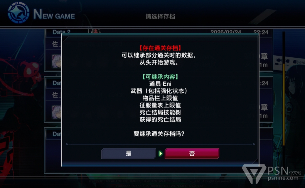 如图是多周目可以继承的内容,多周目游玩时请选择new game,然后选择一个空存档,此时系统就会提示你选择哪个存档继承,再去选要继承的存档就行