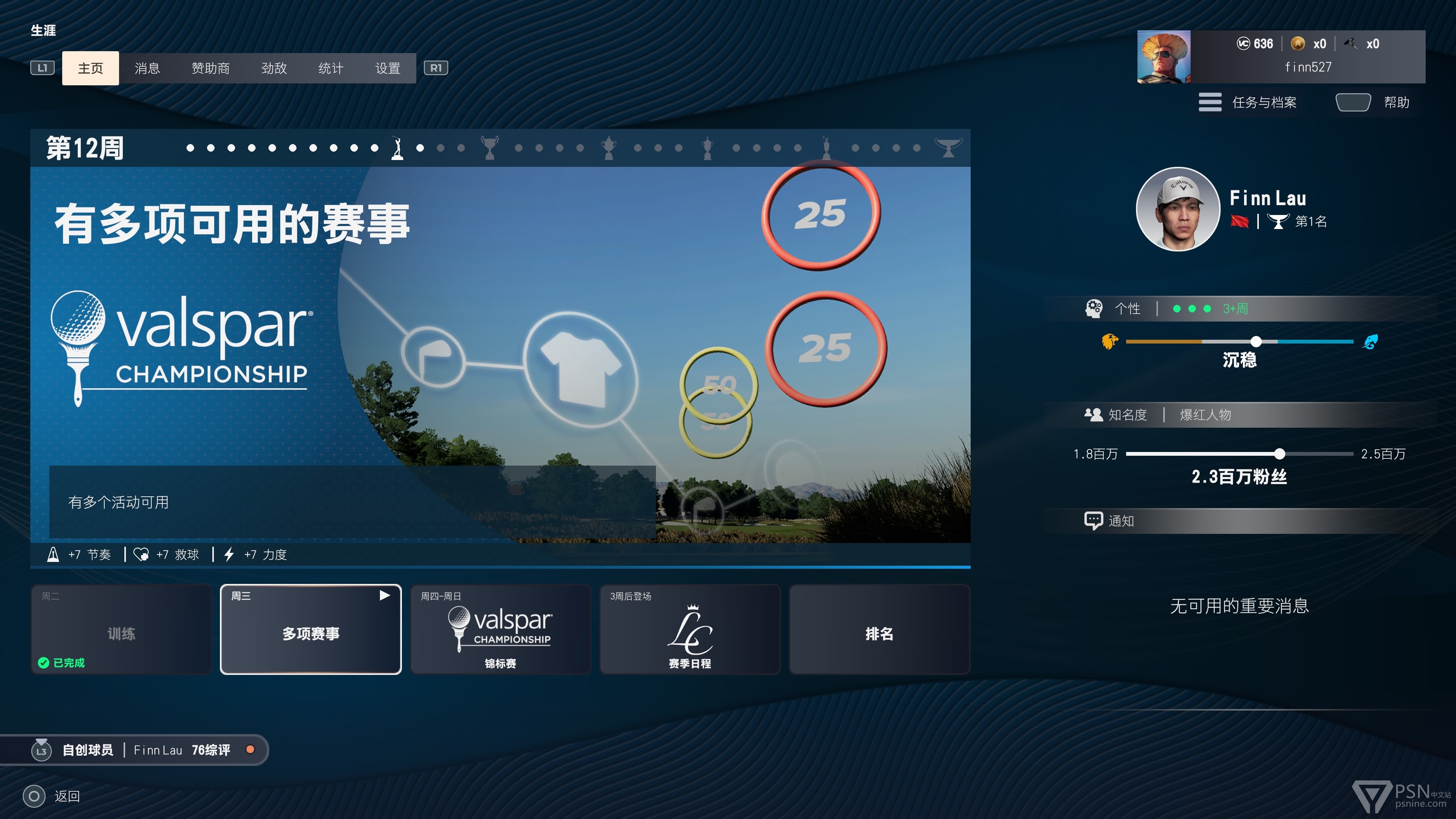 这五项任务前4项算是流程必拿。构建自己的品牌需要开始生涯模式时就要做好规划,否则就会像我一样还要第三赛季刷赞助商活动。赞助商可以选择三种(服饰,球杆和球),刚开始只能选择THE GOLF CLUB一家,建议只签一个位置,等其他赞助商可以签约后在另外两个位置签其他赞助商。与三家赞助商达成层级3之后进入第三项。不喜欢训练和锦标赛前练习的朋友可以直接看练习和锦标赛中间的那项(平时显示锦标赛赛前)是否出现多项赛事(见下图),如果有则有几率出现赞助商活动。之前签约的赞助商达到层级9了之后就可以换成其他赞助商。完成五个赞助商层级5,并且完成5个赞助商活动后进入最后一项。同样需要完成5项赞助商活动。赞助商活动大概一个赛季出现6次,所以千万不要错过。并且未达成前两项的条件赞助商活动不会计数。
