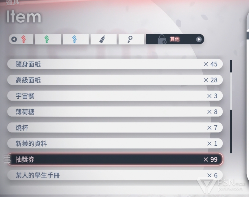 看了下好像遇到问题比较多的就是抽奖这一块,建议每章优先去做因果系谱的个人任务和团队任务,能做的第一时间完成,最好不要拖到下一章,因为完成后,满好感的NPC会在下一章送你抽奖券,满星越多,送你抽奖券的NPC也会越多。从第四章开始,算上商店买东西给的10个,加上个人任务给的,满星好感送的,基本第四章开始每章都能拿到99以上的抽奖券,因果系谱里面有小盒子标记的就是会送抽奖券的。像面纸,歌曲,话题这种根本不缺了,抽奖券和面纸都是溢出的,我终章把所有奖杯全部拿完后,手里有99个抽奖券和40多个面纸,如图: