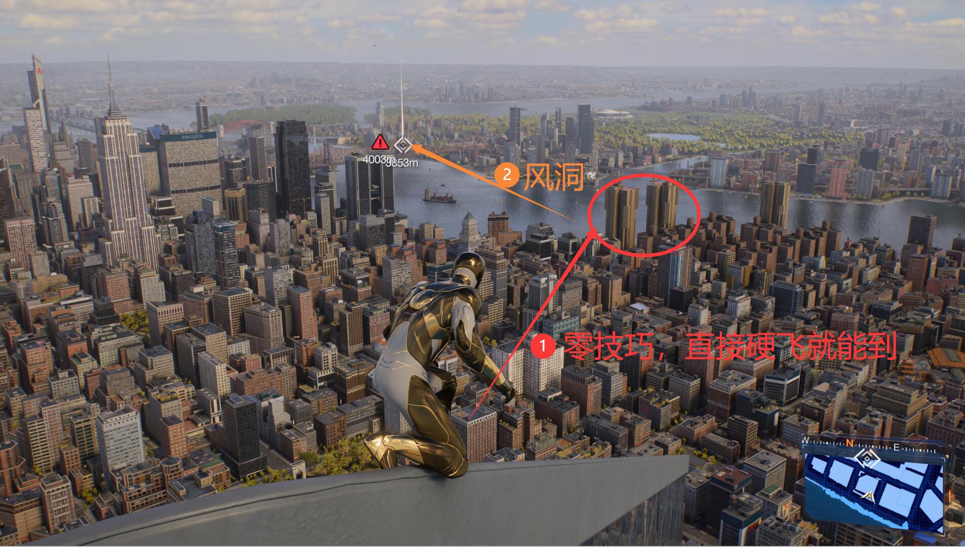 操作也简单到极致,在金融区这个摩天大楼直接硬飞即可飞到风洞上方,直直的往两栋大楼方向飞即可,中间没有任何操作,这座楼太高了,有非常高的余量让你飞到风洞上方,然后钻这唯一一次风洞即可直达阿斯托利亚,包一次过。